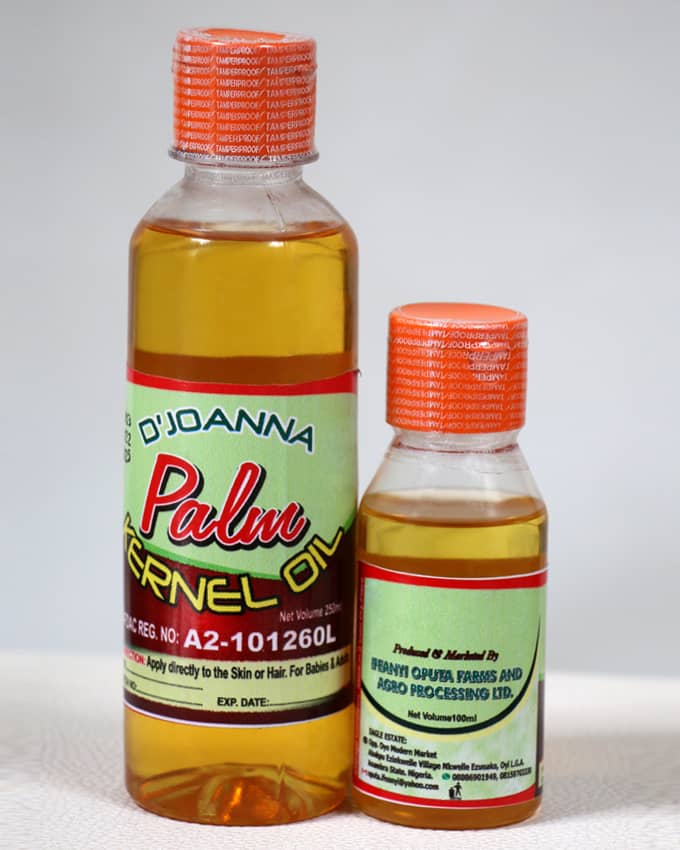 D'Joanna palmkernel oil is a NATURAL Organic or crude palmkernel oil extracted from palmkernel nuts,The major natural ingredient is LAURIC ACID which makes it potent in the attack of micro organisms. The cold press orange palmkernel oil is richer than the black one as confirmed in the research work published in 'AFRICAN JOURNAL OF BIOTECHNOLOGY, june 2006.